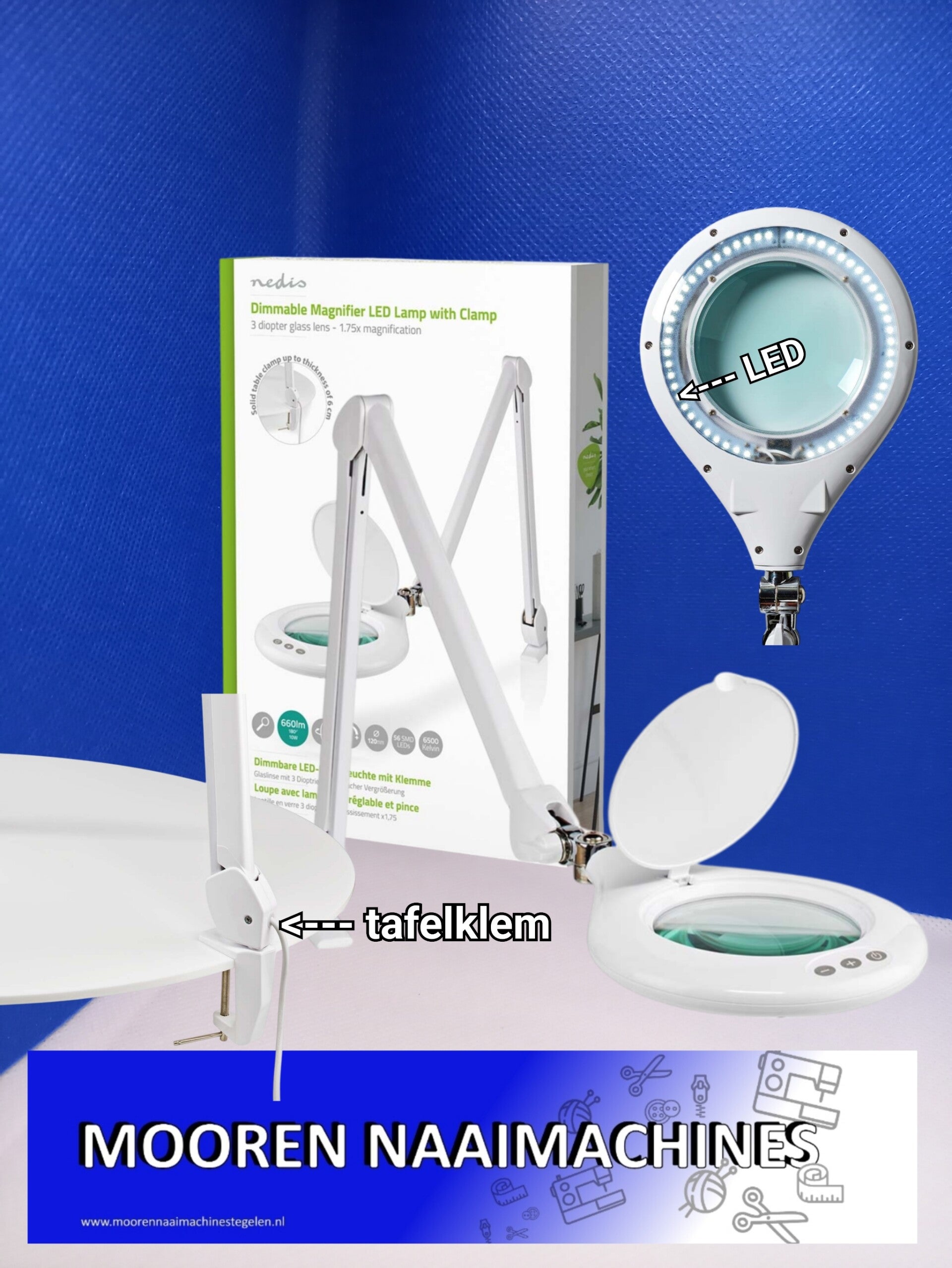 Het vergrootglas wordt verlicht door 56 SMD LED's met een lichtsterkte van 660 lumen en een kleurtemperatuur van 6500 Kelvin. Bovenop zit een beschermkap en de lampjes zijn afgedekt door een transparante lampcover, wat zorgt voor zeer helder en duidelijk licht. De flexibele wendbare arm kan worden vastgeklemd aan een bureau, tafel of ander oppervlak. De lengte van de arm is 125 centimeter. Dit betekent dat je moeiteloos elke gewenste setting kunt creëren voor al het werk.