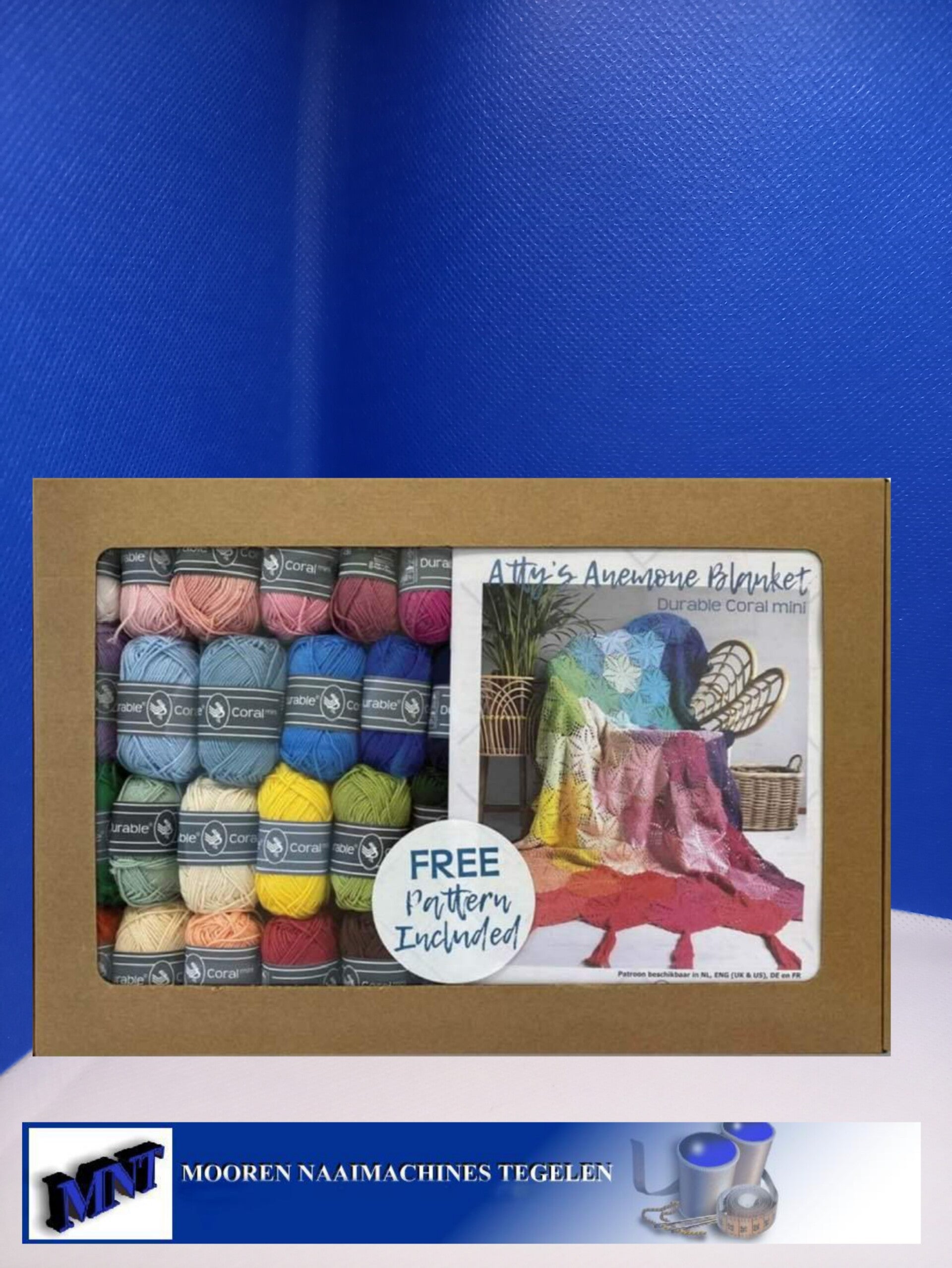 Een grote assortimentsdoos gevuld met 88 bollen Coral mini. Het draagbare pakket bevat 86 kleuren van het Durable Coral Mini Katoen 20 gram en een patroon voor de 'Anemone Blanket' ontworpen door Atty. Het patroon is ontworpen voor in combinatie met nagenoeg alle kleuren Coral mini.