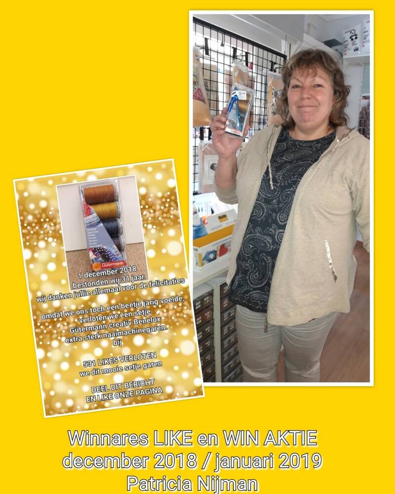 De winnares Patricia Nijman, heeft haar prijs in ontvangst genomen, heel veel naai plezier met het Gütermann creativ Benelux JEANS naaigaren set
